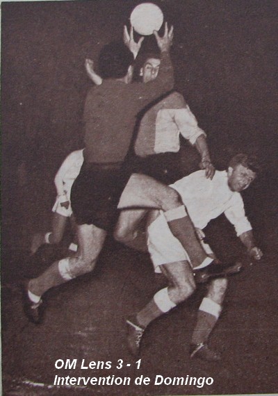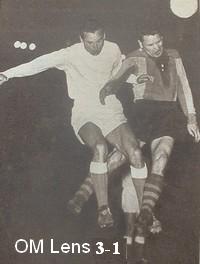 Le premier quart d'heure aux Lensois. Le jeu des Nordistes plus dense et plus précis que celui des Marseillais, obligeait souvent ces derniers à reculer en masse sur les attaques " sang et or " qui, fort heureusement pour les défenseurs de l'O.M., étaient généralement assez mal terminées. A la 12e minute, sur rentrée en touche remarquable de Louis, reprise par Stievenard, Wisnieski, d'une balle de la tête, manquait de justesse de battre Domingo, par ailleurs, souvent alerté. Le premier quart d'heure était ainsi au très net avantage des Lensois, devant un O.M. assez inconsistant, mais cette domination demeurait platonique. A la 15e minute pourtant, sur contre-attaque, une bonne balle du jeune intérieur droit marseillais Léonetti était reprise par Andersson, de plein fouet, et Sowinski avait toutes les peines du monde à la bloquer en se couchant sur la ligne. Les joueurs marseillais, ainsi d'ailleurs qu'une partie du public, réclamèrent même le but, mais l'arbitre M. Devillers , en jugea autrement. Le match s'animait, devenait plus équilibré et, tout à tour, les deux gardiens étaient alertés, Domingo par Théo (17e) et Sowinski, sauvé par la barre (28e), sur tir d'Andersson. |